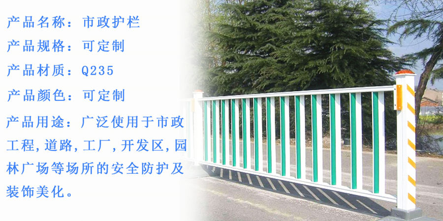3、市政护栏是目前国内外最受欢迎的道路隔离护栏之一。主要用于场区隔离带,市政工程隔离带,园林护栏,市政建设中的公园、草坪、动物园、池湖、道路、及住宅区的隔离与防护,宾馆、酒店、超市、娱乐场所的防护与装饰。  市政护栏广泛使用于市政工程,道路,工厂,开发区,园林广场等场所的安全防护及装饰美化;还可用于小区、庭院、别墅,其线条流畅、简洁美观、富有浓郁的现代气息,让小区生色,让庭院生辉,让别墅具有时代的高品位。;其产品造型美观,而且牢固,防腐性好,安装简单、维修方便、容易清洗、经济实用,免除维修,结构美观,与环境协调性好。是美化城市环境工程的首选产品。