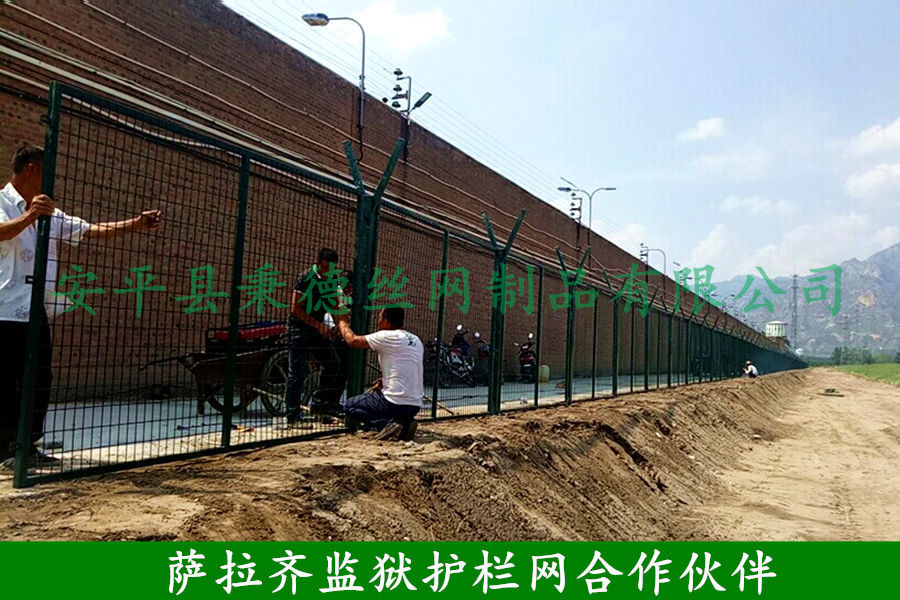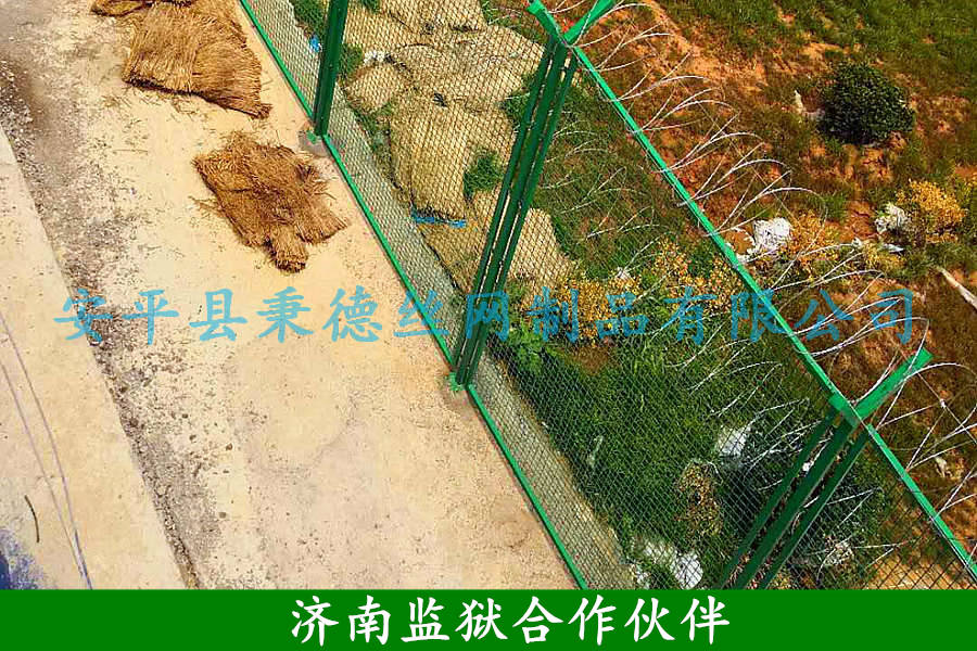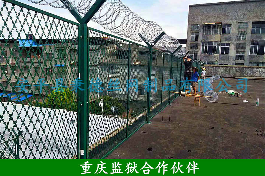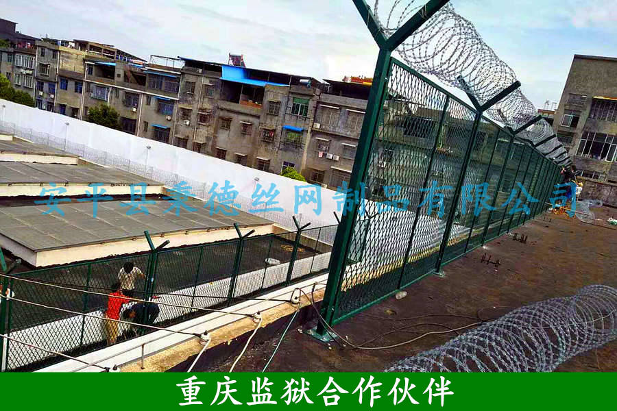 监狱护栏网又称作“Y型安全防御护网”和机场护栏网通用,是由V型支架立柱,加强型焊接片网,安全防盗连接件和热镀锌刀片刺笼组成强度和安全防御性级别很高。近年来,被广泛应用在监狱,军事基地等高安全场所。注:如果在监狱护栏网顶部加装刀片刺丝、刀片刺绳后又很好的增强了安全防护性能。采用电镀、热镀、喷塑、浸塑等防腐形式,具有很好的抗老化、抗晒、耐候等特点。其产品造型美观、花色多样,既起到围栏作用,又起到美化作用。由于具有安全性高、防攀爬能力好,网片连接方式采用特制SBS紧扣件,有效防止人为的破坏性拆卸,横向四道折弯加强筋,使网面强度显著增加。